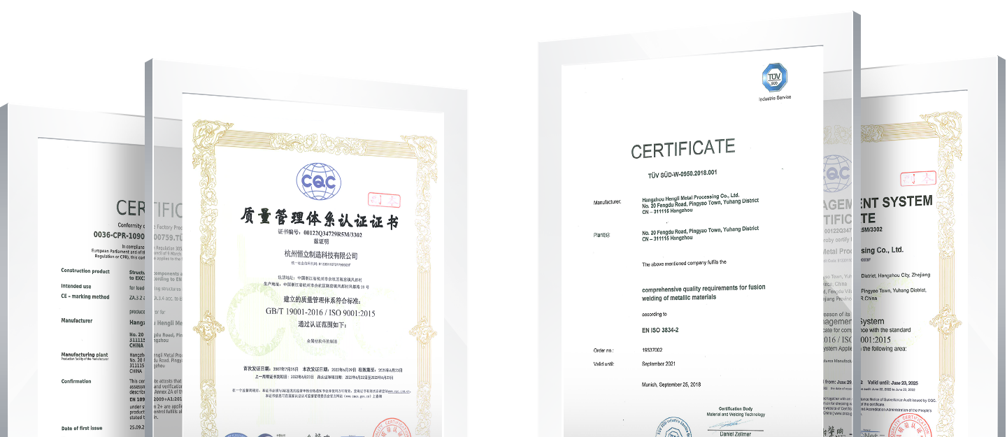恒立制造榮獲多項質量認證,包括ISO 3834國際焊接質量體系認證;ISO 9001國際質量管理體系認證;EN-1090-1認證
